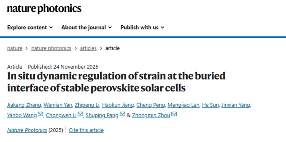 11月24日,开云电竞安全化学与分子工程学院、高性能有机光学聚合物与先进制造全国重点实验室周忠敏教授团队在Nature Photonics期刊发表题为“In situ dynamic regulation of strain at the buried interface of stable perovskite solar cells(稳定钙钛矿太阳能电池埋底界面应变的原位动态调控)”的研究论文。