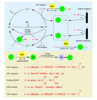 卤素原子转移(XAT)策略可通过有机卤化物高效生成碳自由基,进而实现各类碳—碳与碳—杂原子键的精准构建,是复杂分子合成领域极具潜力的核心工具。本综述根据不同的自由基物种,系统总结了芳基、烷基、硅基及硼基等自由基参与的XAT策略研究最新进展。同时,针对光催化(涵盖能量转移驱动及电子受体复合物介导的反应历程)、电催化及其他催化体系介导的有机卤化物XAT过程,展开了全面且深入的机理分析与应用探讨。