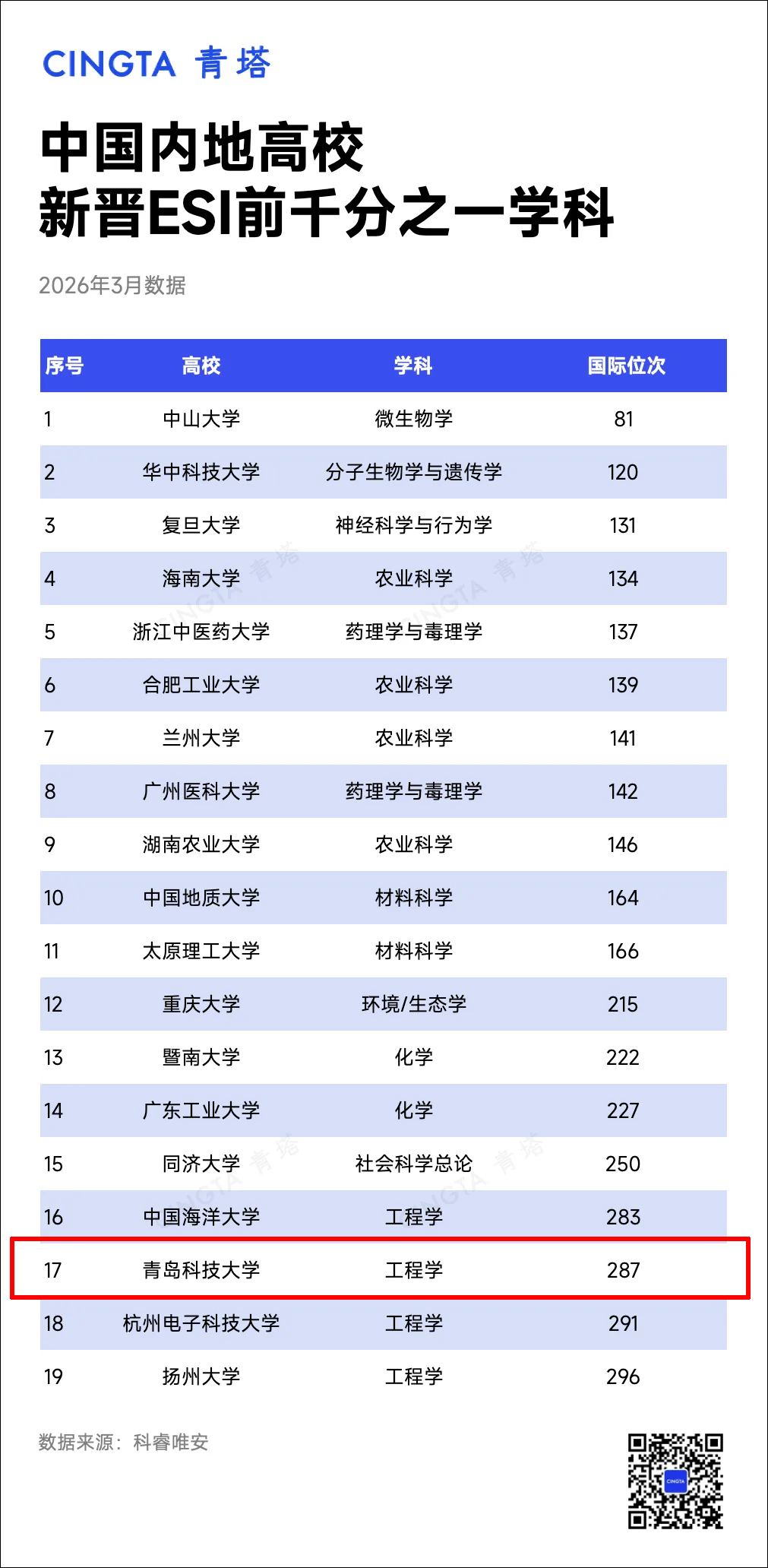 截至目前,学校化学、工程学、材料科学、环境科学与生态学、计算机科学、生物学与生物化学、农业科学7个学科进入ESI全球排名前1%,其中化学、工程学2个学科进入ESI全球排名前1‰,化学最新ESI千分位为0.470‰,工程学最新ESI千分位为0.962‰,各学科排名较上一期数据均有稳步提升。